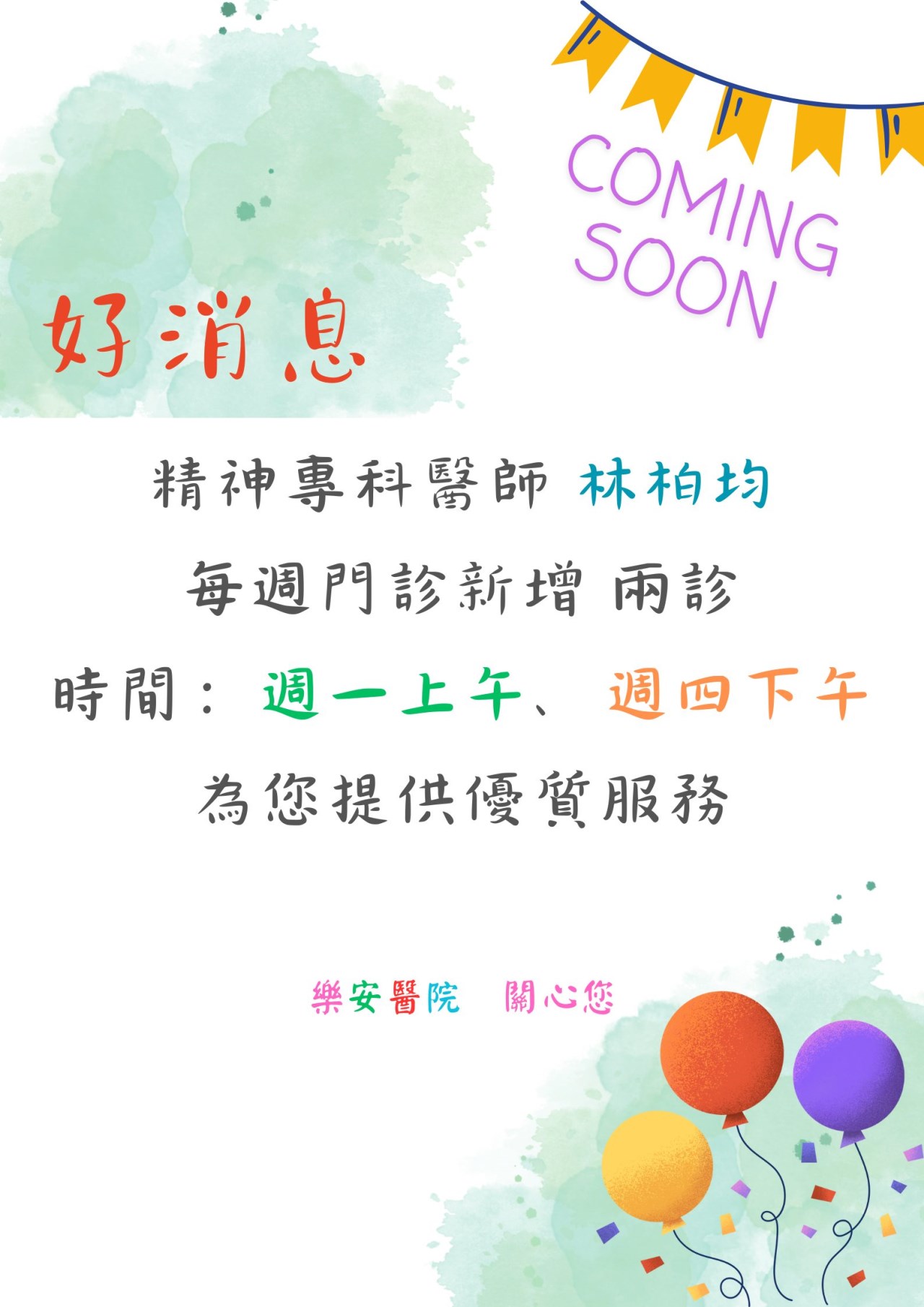 號外!!!本院為強化醫療看診及服務廣大民眾,特新增門診時段,請參考