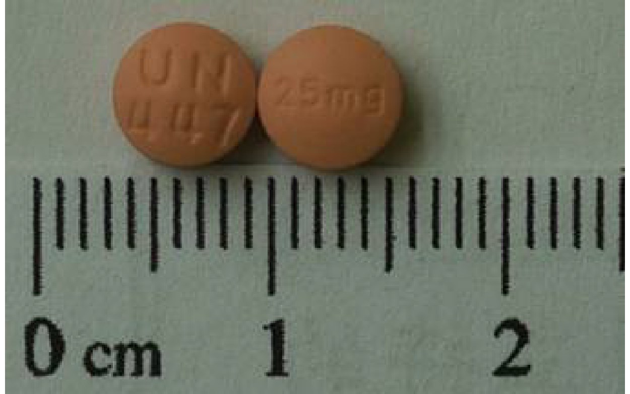 - 開始劑量每日25mg,劑量每日增加25~50mg,到達有效劑量為止